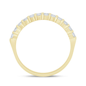Celebrate your marriage with this stunning 14K wedding band, expertly crafted in white and yellow gold. Featuring .25 carats of machine-set diamonds, this piece combines timeless elegance with modern precision. Perfect for everyday wear or as a meaningful addition to your bridal collection.