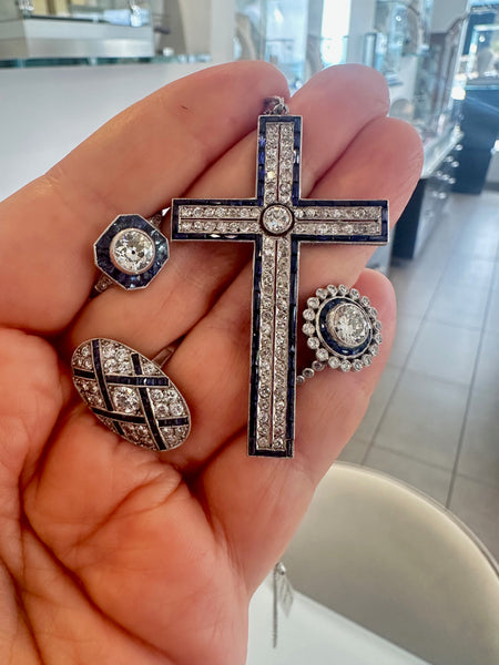 This handmade platinum ring features a 0.23ct old European cut center diamond, accented by 1.20ct of sapphires and 0.40ct of smaller diamonds. Weighing 5.8 grams and sized at 5.75, it blends classic elegance with refined craftsmanship for a sophisticated look.