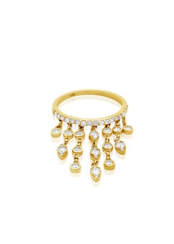 Elevate your ensemble with our exquisite Diamond Chandelier Ring. Meticulously crafted in lustrous 14k gold, this statement piece features delicate diamond dangles that cascade in a sophisticated chandelier design. Each movement of your hand creates a subtle shimmer, capturing light from every angle. A refined addition to your fine jewelry collection that transitions effortlessly from day to evening wear.