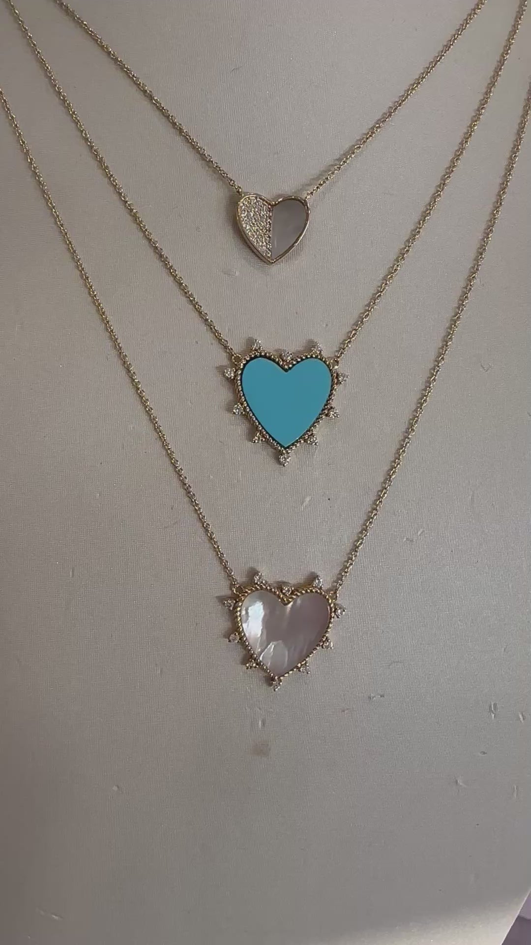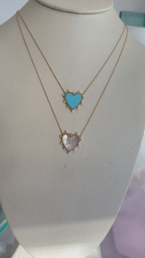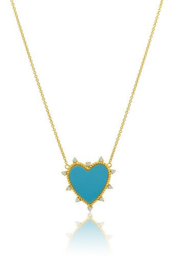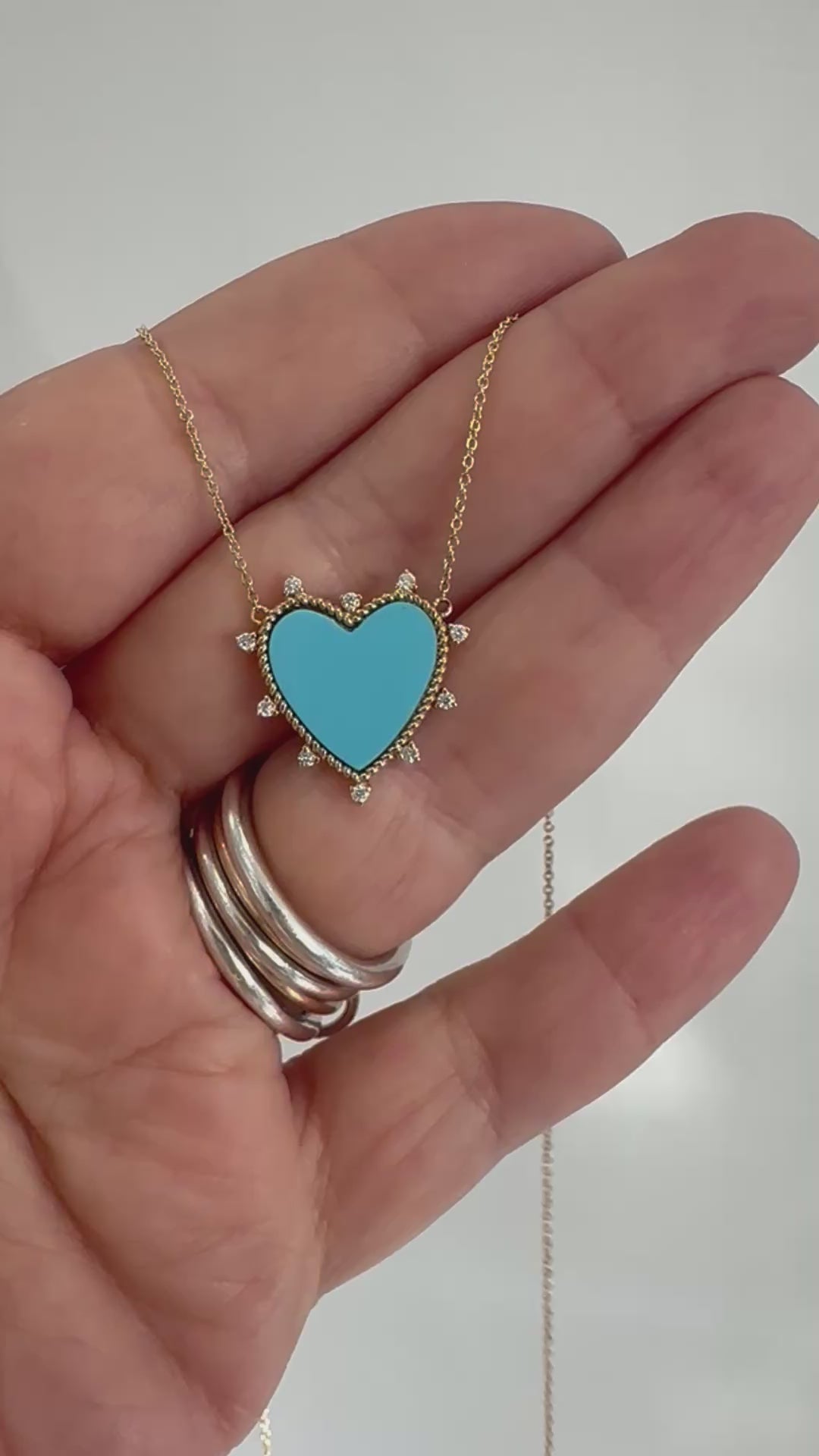 Elevate your ensemble with our Large Turquoise Heart Necklace with Diamonds. This exquisite piece features a stunning turquoise heart pendant adorned with brilliant diamonds, all meticulously set in luxurious 14k gold. The vibrant turquoise symbolizes wisdom and protection, while the timeless diamond accents add a touch of refined elegance to this sophisticated statement piece.